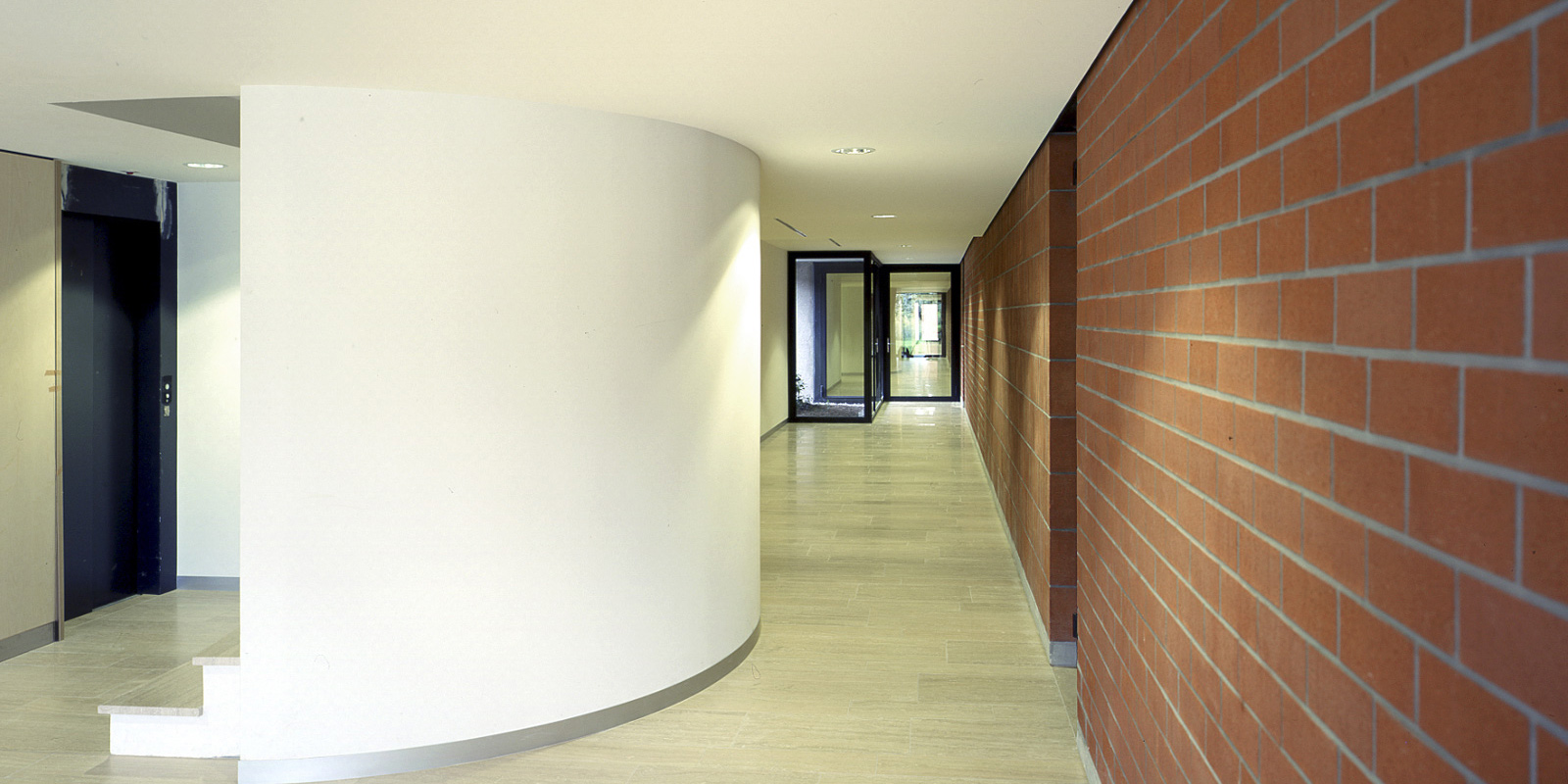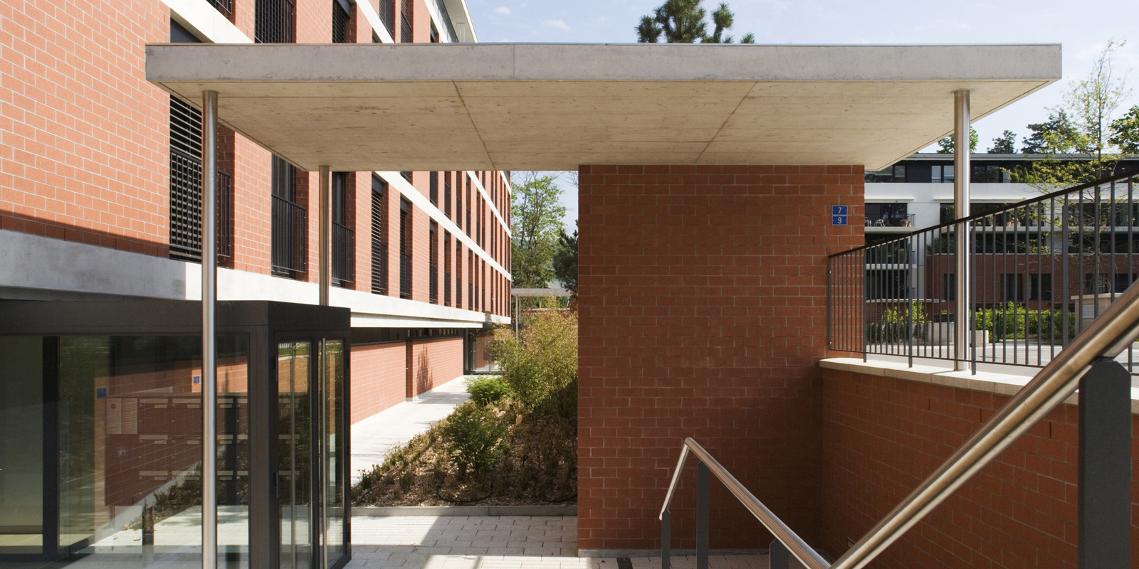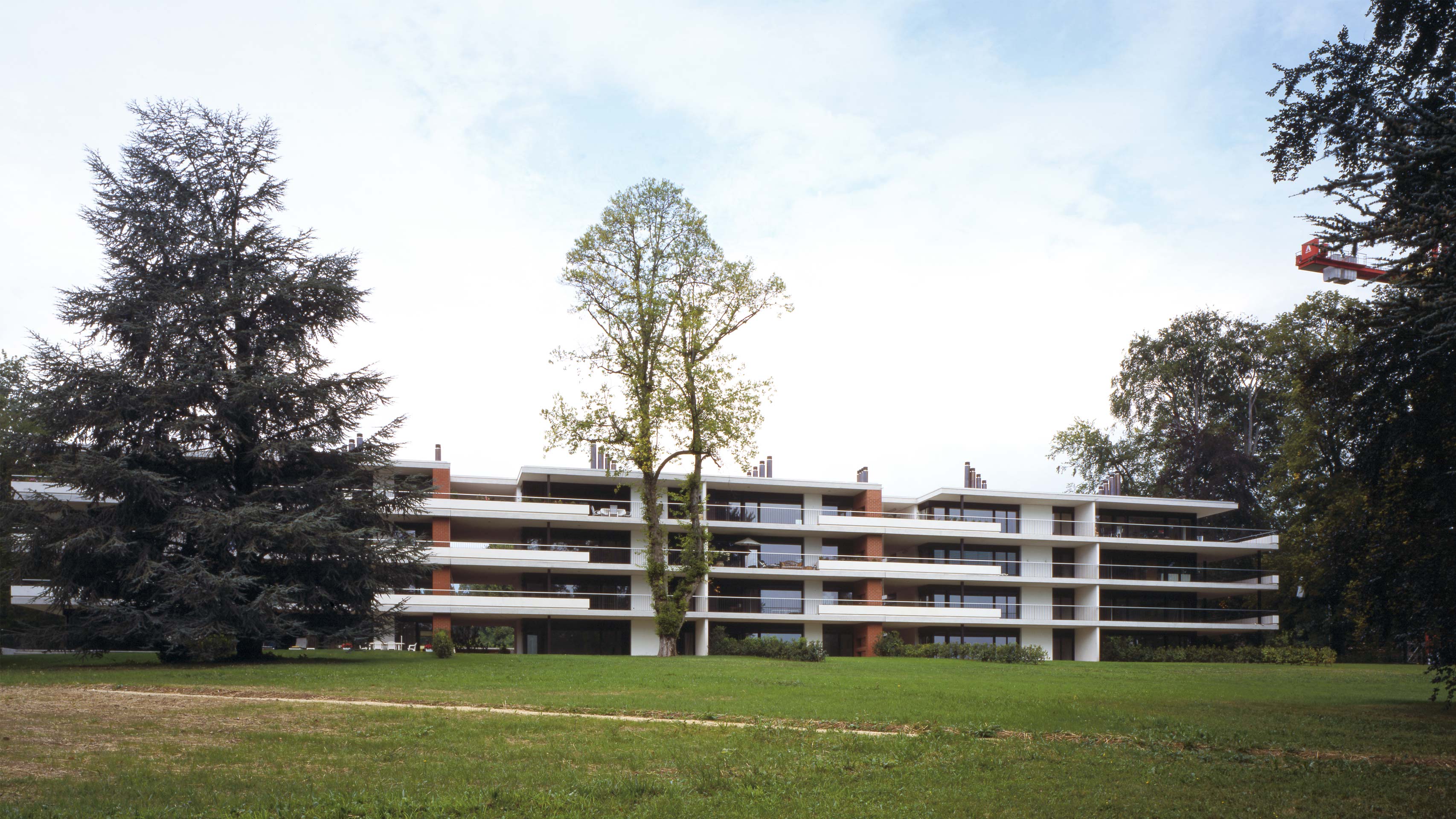 The Uttins Quarter occupies a large tree-lined plot located a stone's throw from the historic centre of the town of Rolle. In accordance with the rules of the neighbourhood plan legalised in 1996, the four residential buildings and three office buildings that make up the neighbourhood are located on the perimeter of the site and along the access road, freeing up two large communal green spaces. Built between 2000 and 2009, the buildings have different characteristics (size, shape, position on the site, use), but display their similarity thanks, in particular, to the unity of materials, dominated by red brick and grey or white concrete, and the consistency of the access systems. This sense of unity and consistency gives the neighbourhood a strong identity. In terms of access, the four residential buildings share a careful management of the transition between the public space of the street and the private space of the dwelling, through semi-public outdoor spaces - adapted to the topography - and semi-private distribution spaces, a kind of internal street. In terms of typology, these four buildings develop variations on the bar type, from the articulated bar in plan and section (E, G), through the cut-out, stepped bar (F, G), to the hybrid type of building D, whose three sections, connected by terraces, present a continuous façade on the park side, but which, on the street side, can be seen as the articulation of three blocks defining two open courtyards.