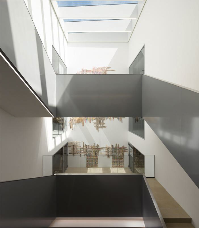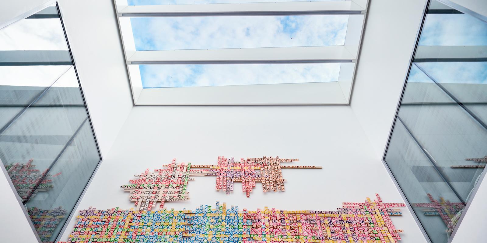 More especially at night-time, the building’s cantilever showcases the spectacular, over 100 m2 wall of the lobby. Very early on, and in agreement with the client, we imagined how we could highlight this space. At night-time, the indirect ceiling lighting gives the impression that the front part of the building is actually levitating and offers perfect visibility for hosting major artistic creations. We had the great pleasure to organize a competition with 5 young Western-Swiss artists and Maya Rochat’s works were selected and installed in the lobby and those of Anouchka Perez in the atrium. This concept could be renewed every other year and would be a way of perceiving the building in a new light whilst promoting the creativity of young artists from Western Switzerland.