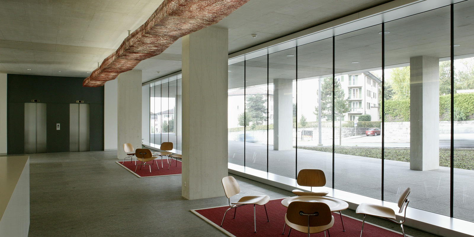 This building is located at the outskirts of the city of Lausanne, along one of its main access roads from the north. The simple volume resulting from a rather straightforward programmatic demand—the commercial leasing of office spaces—was also informed by city regulations, prescribed by the department of urban planning, that imposed the outline of the building and the construction of an attic. At ground level, the volume rests on a piloti structure to allow circulation through access porticos. Though the building presents itself from three sides as a concrete monolith, the facade towards the road is radically different. This entire elevation is composed of a glass skin protected by a series of aluminium and glass vertical brise-soleil. The shades differ from similar wing shaped elements in that only two thirds of each element is opaque; the remaining third is of a tinted glass. When totally closed, the brise-soleil still allow some light in and visual contact with the exterior. Being controlled independently by the users of each corresponding inside space, the position of each set of shades varies, creating a movement within the facade. The alternation of aluminium and glass and the resulting play of light and shadows also contribute to animate this side of the building. The rest of the volume is treated in exposed concrete using white cement with aggregates made from a yellow stone found in the Swiss Juras Mountains.