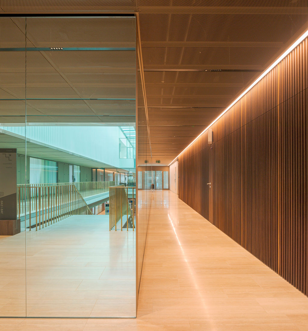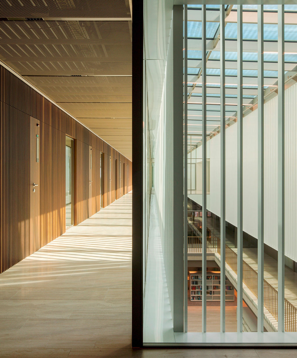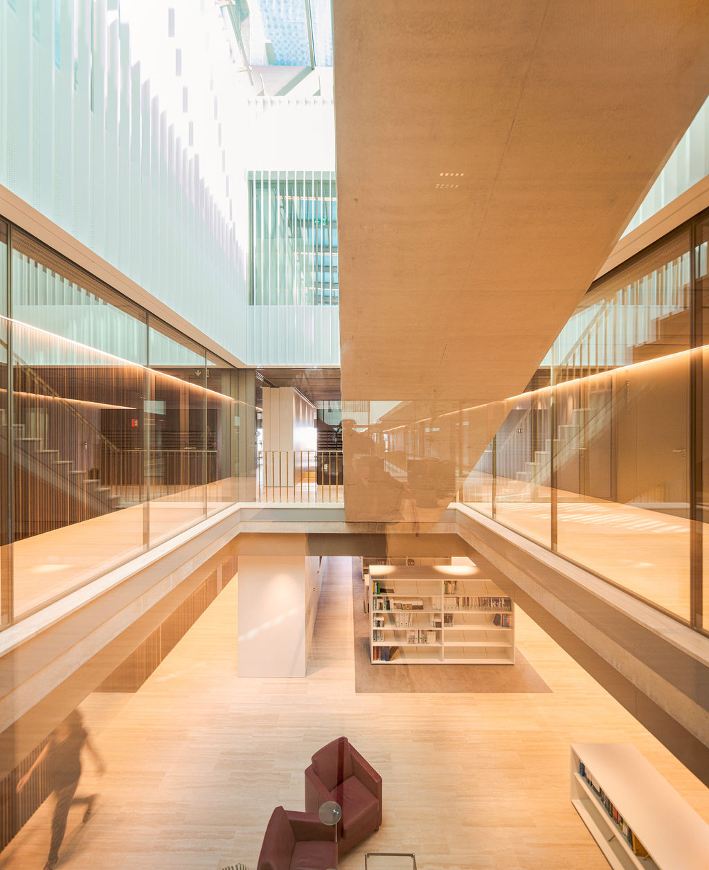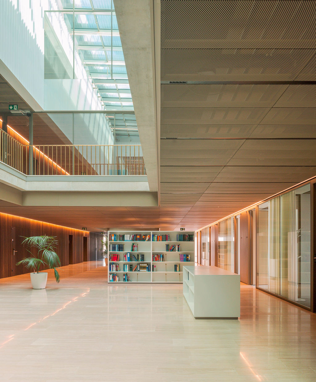 The central strip houses an atrium topped by a glass roof that brings natural light into the heart of the building. This central, integrating space connects and distributes the three levels. It houses staircases and meeting rooms, and on the first floor, the library and its consultation area.