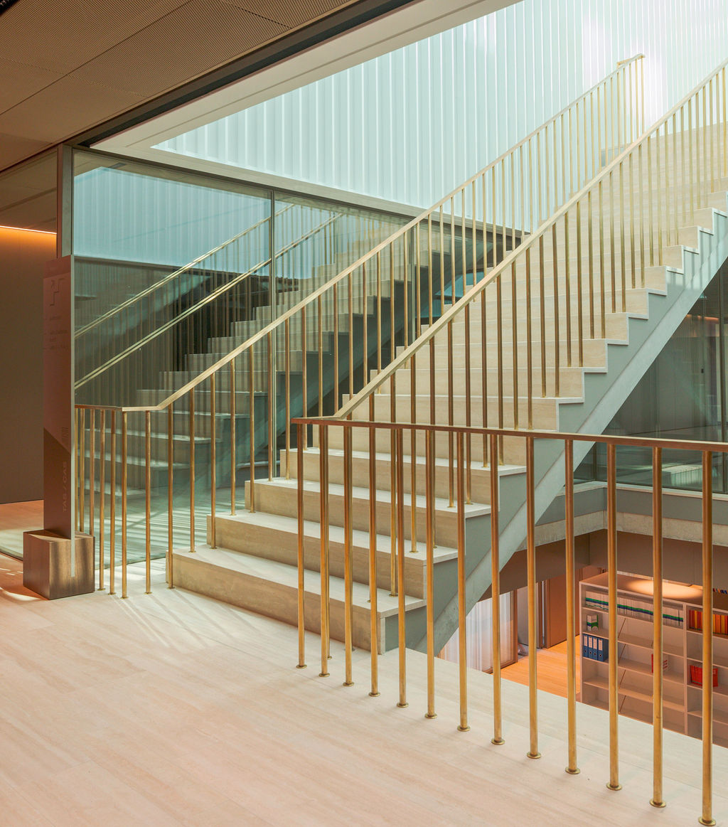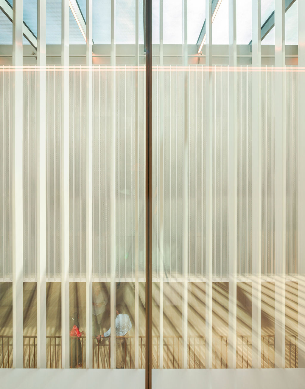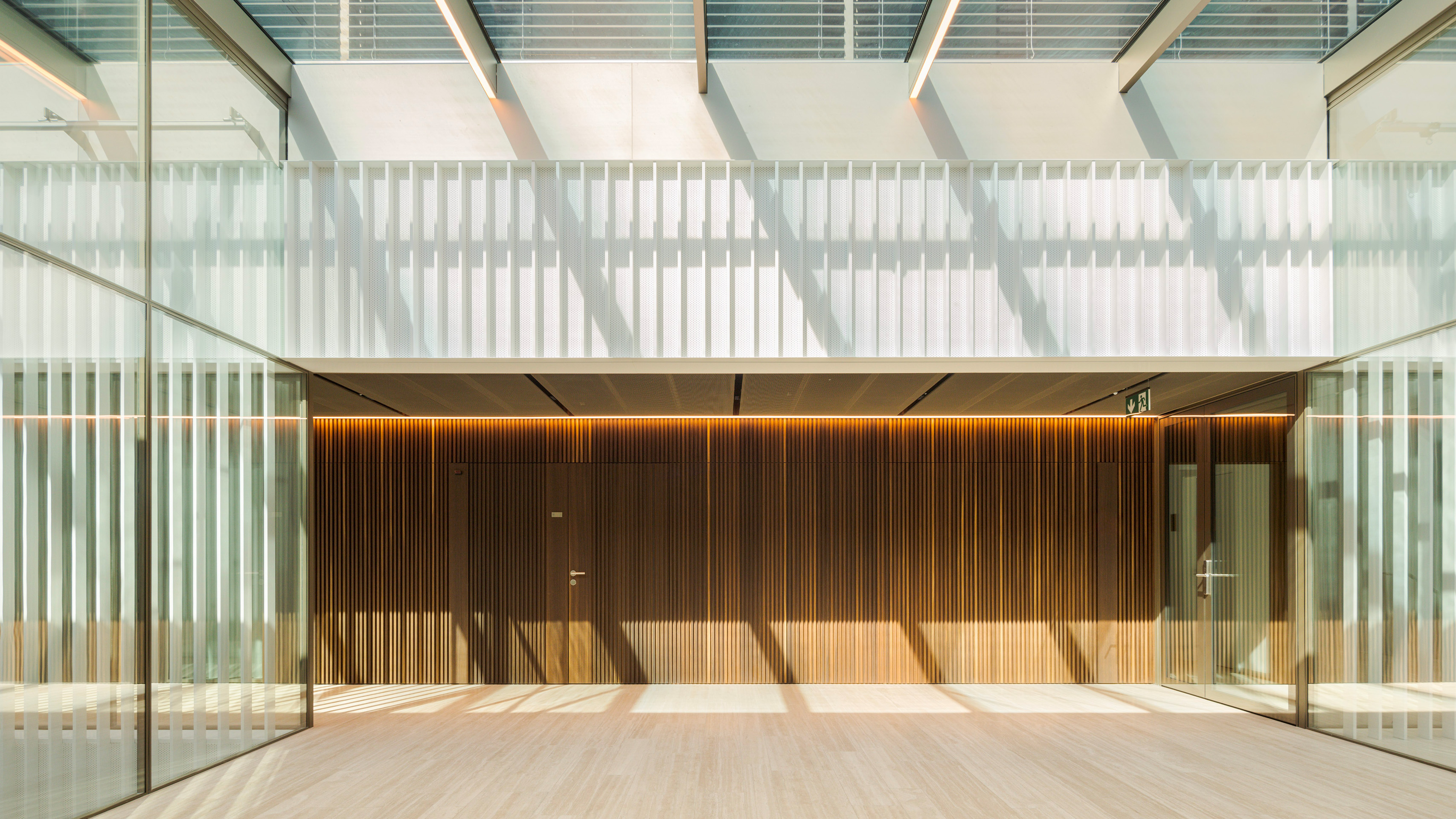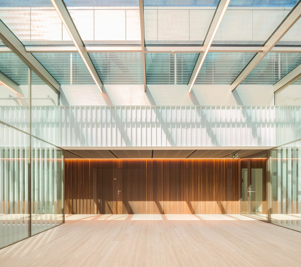 The central strip houses an atrium topped by a glass roof that brings natural light into the heart of the building. This central, integrating space connects and distributes the three levels. It houses staircases and meeting rooms, and on the first floor, the library and its consultation area.