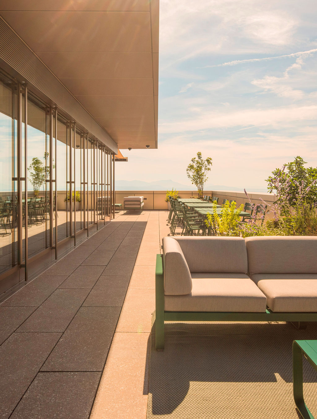 The architectural treatment of the attic is characterised by a fully glazed façade, the eaves of which emphasise its lightness. Its horizontality crowns the mineral façade of the Palais de Beaulieu, offering a reading of a classic unitary composition, while allowing for the distinction of an emergence suggesting a specific programme.