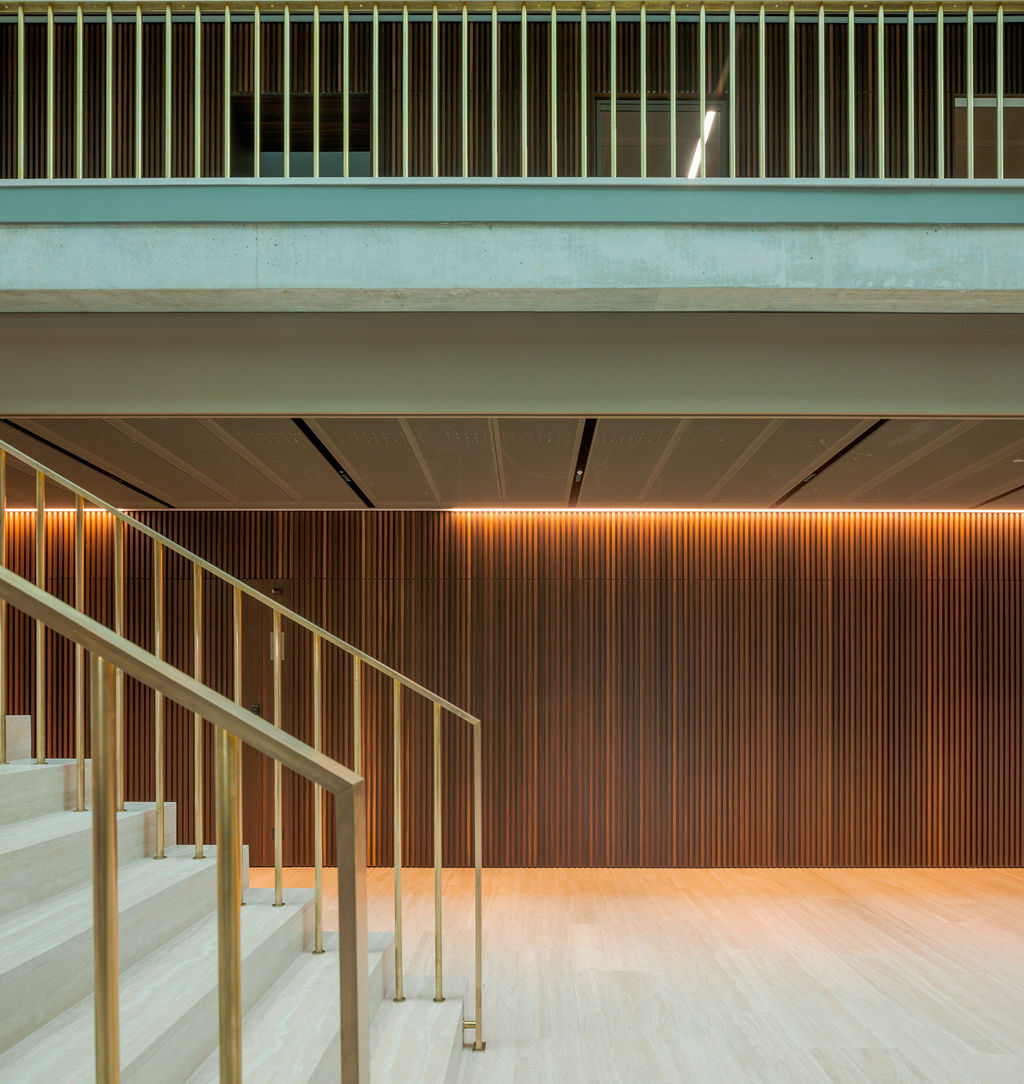 The vertical circulation cores (stairs and lifts) are located at both ends of the building, with the stairs on the east side also serving as an evacuation route for the theatre. The programme is completed by a second recessed attic housing the cafeteria and a sports hall.