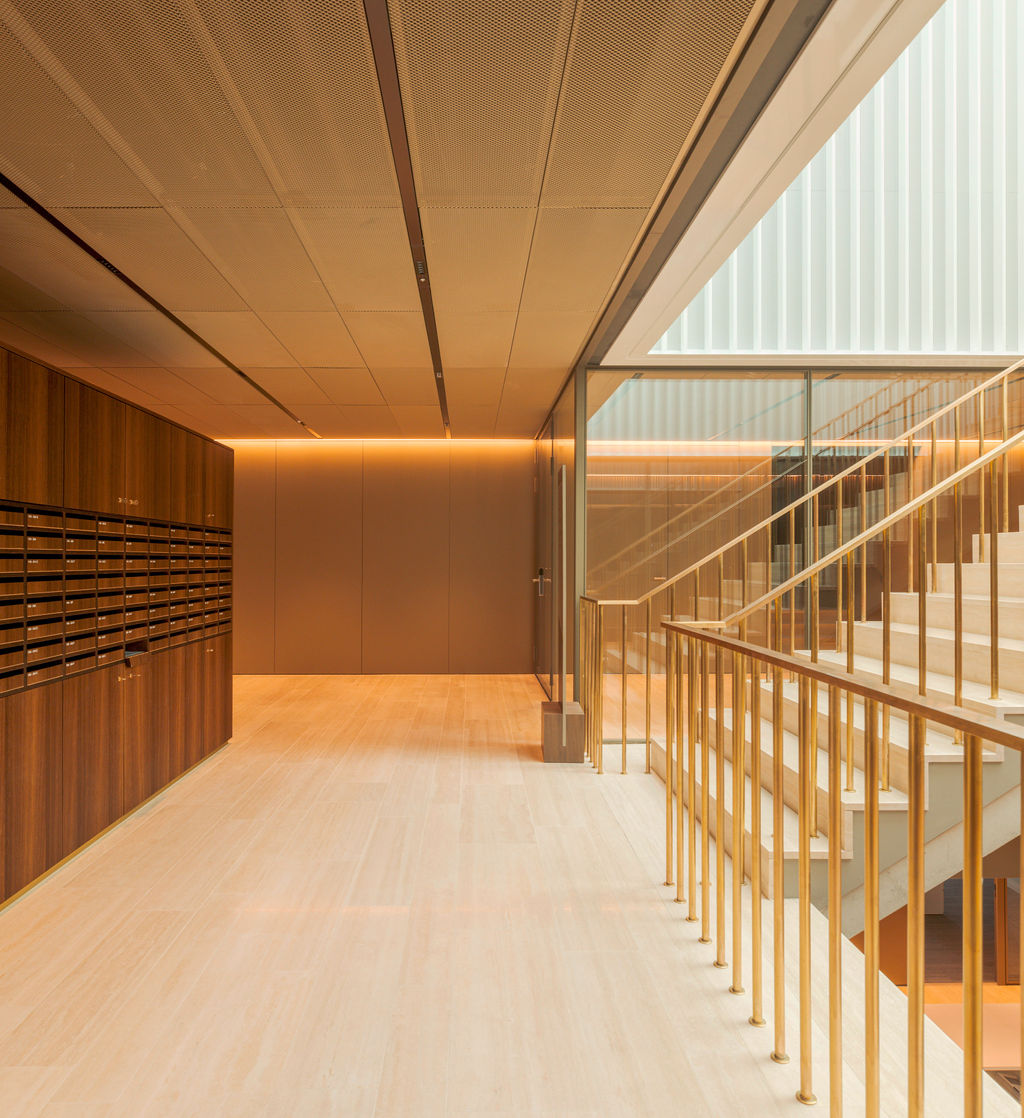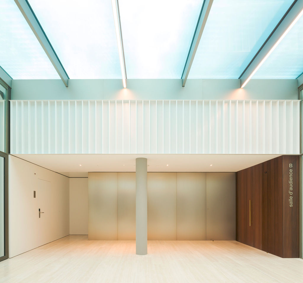 The choice of materials reflects the desire to express the institution's values of rigour, efficiency and transparency, and to favour a contemporary response that respects the particular historical character of the Palais de Beaulieu, whose modernity does not exclude a certain classicism.