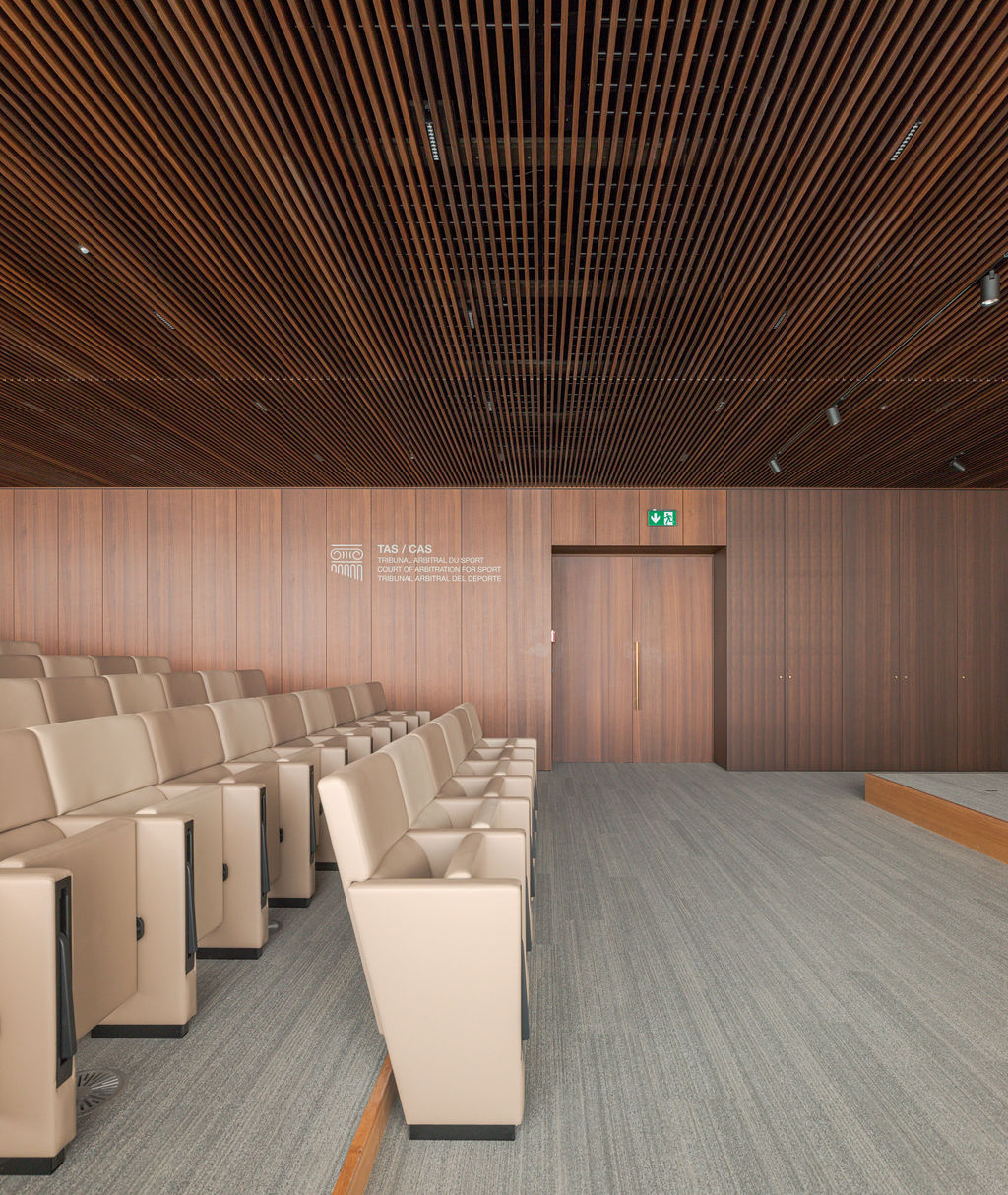 A new attic-level volume is added to the south wing. This houses the hearing rooms: a 100-seat auditorium, two courtrooms with around 30 seats each, with their respective translation rooms, a spacious foyer, as well as caucus rooms and the arbitrators' room. The CAS management offices are located at the western end.