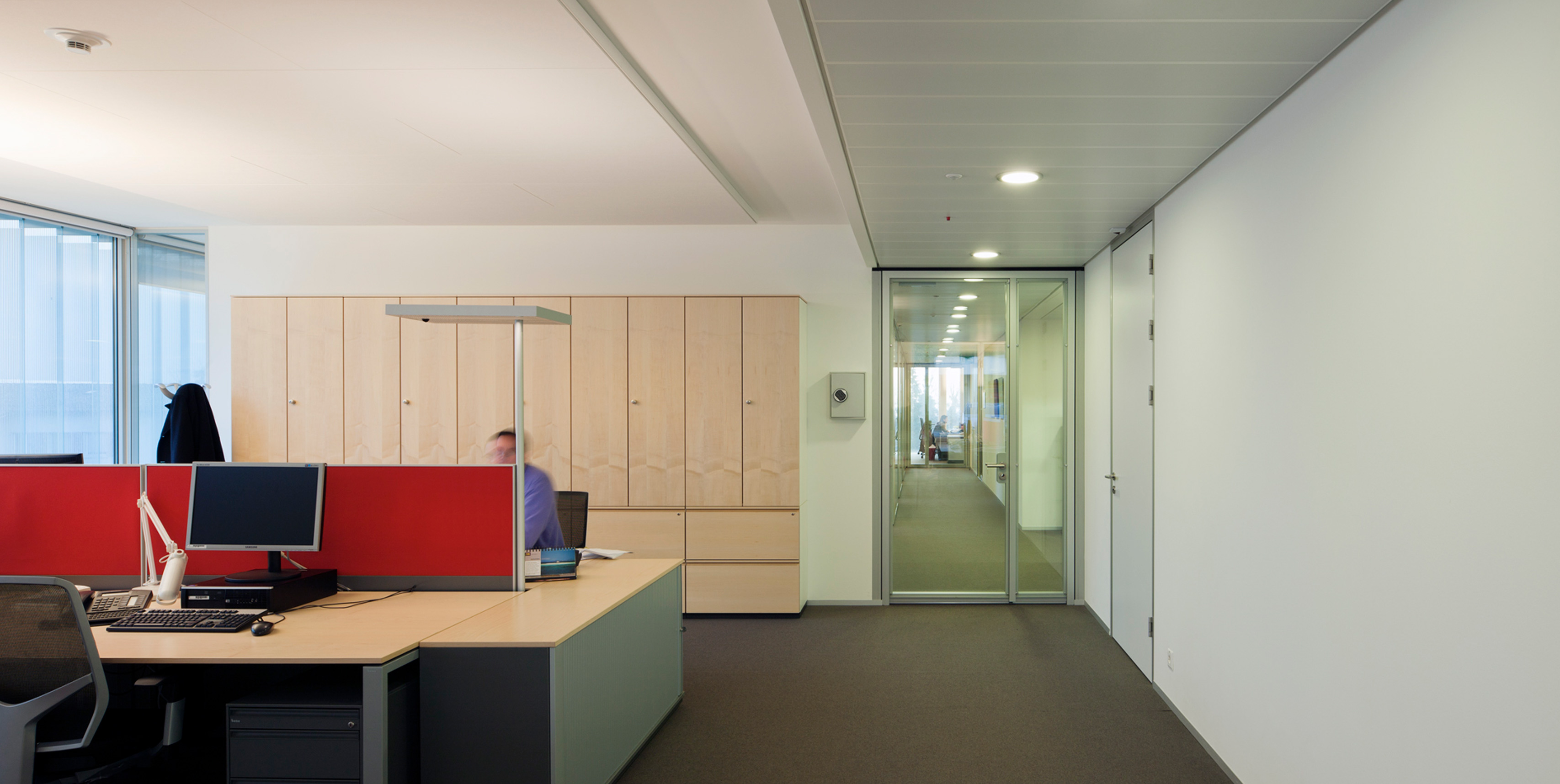 The simple floor plan is arranged around a central core. At the heart of the building are the vertical risers, washrooms, service areas and ducts, leaving the outer areas free for the work space. The offices are based on a grid plan of 1.7m allowing maximum flexibility of use, with possibility for individual offices, shared offices and open plan areas. Compact and logical, the building meets stringent requirements in terms of energy savings. Firmly rooted to the ground, the building opens out generously to the environment. Each storey is highlighted by cornices which on the southern side project out to form generously dimensioned canopies. These give the full height panorama windows protection from the sun and project the building towards the lake and the surrounding landscape.