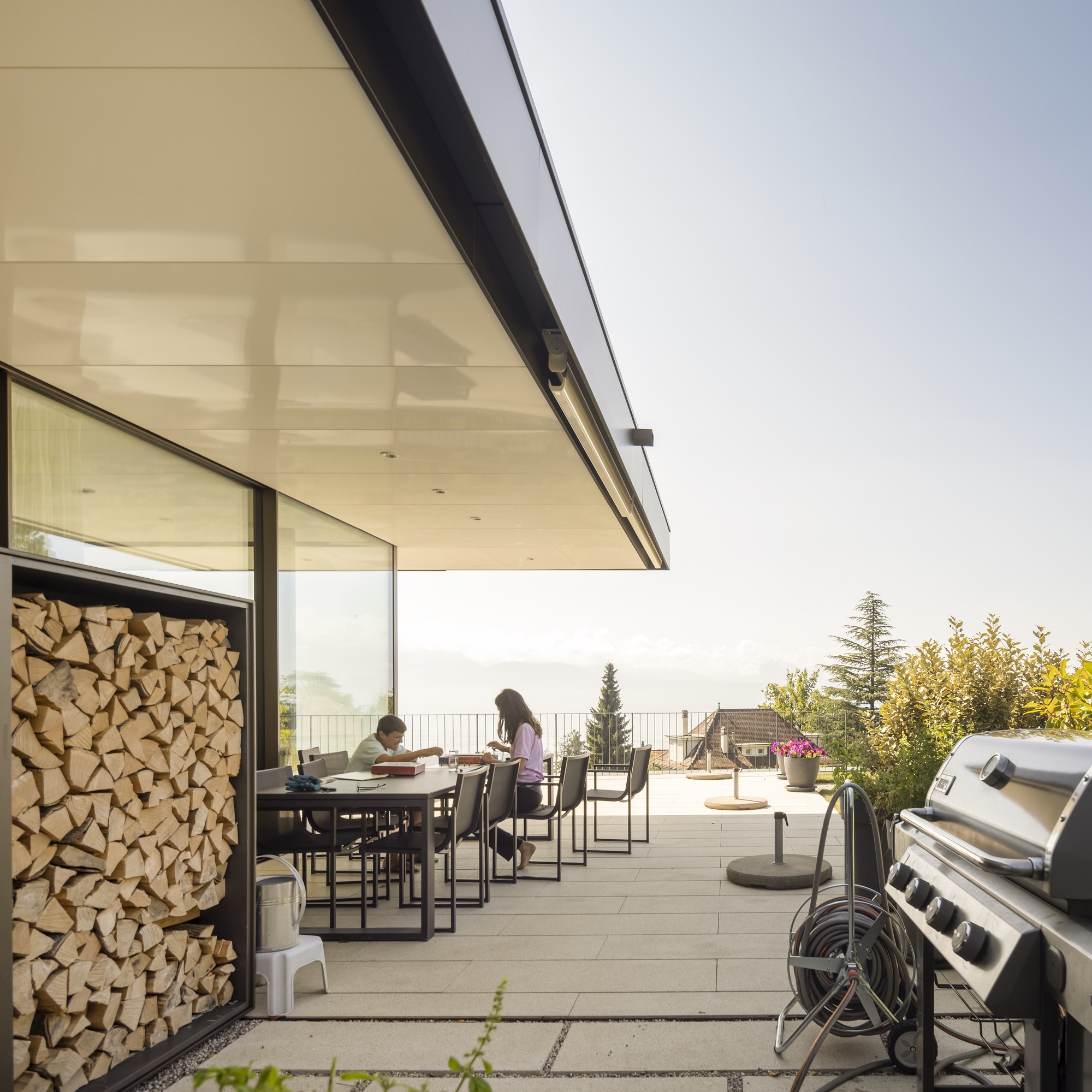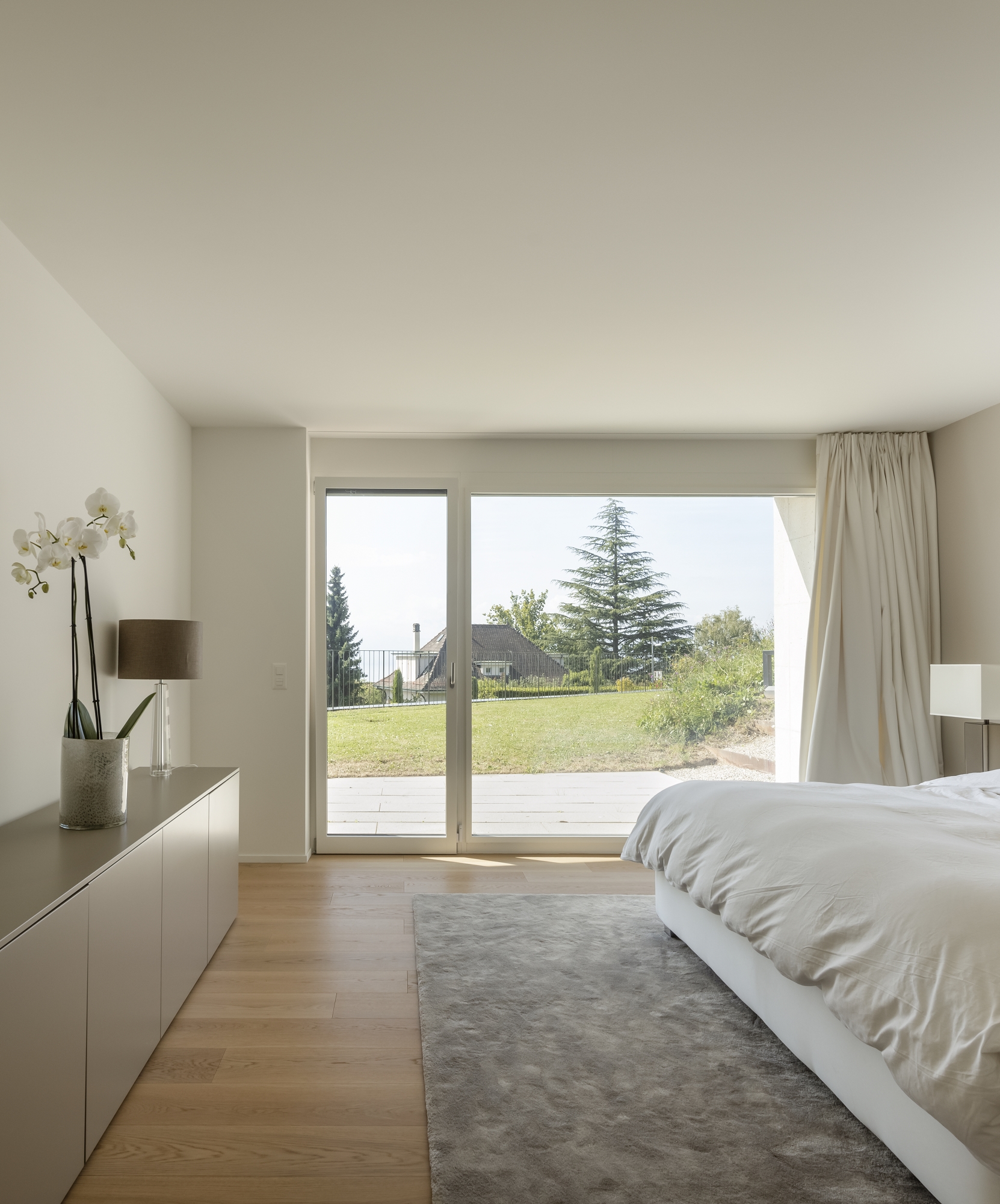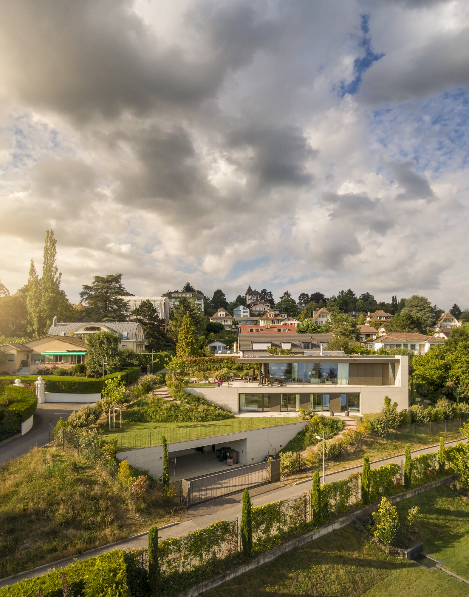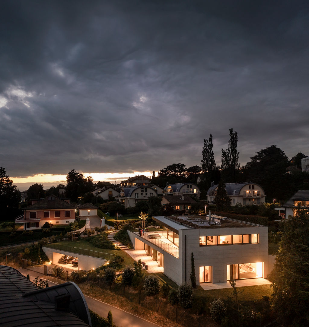 Located on a sloping plot facing the lake, the villa occupies a pointed parcel resulting from the division of a larger property. During the preliminary studies, the layout of the house was carefully analysed, in plan and section, in order to optimise and enhance its relationship with the view of the Lake Geneva landscape, while preserving the openness and views from the villa located to the north of the original plot.
