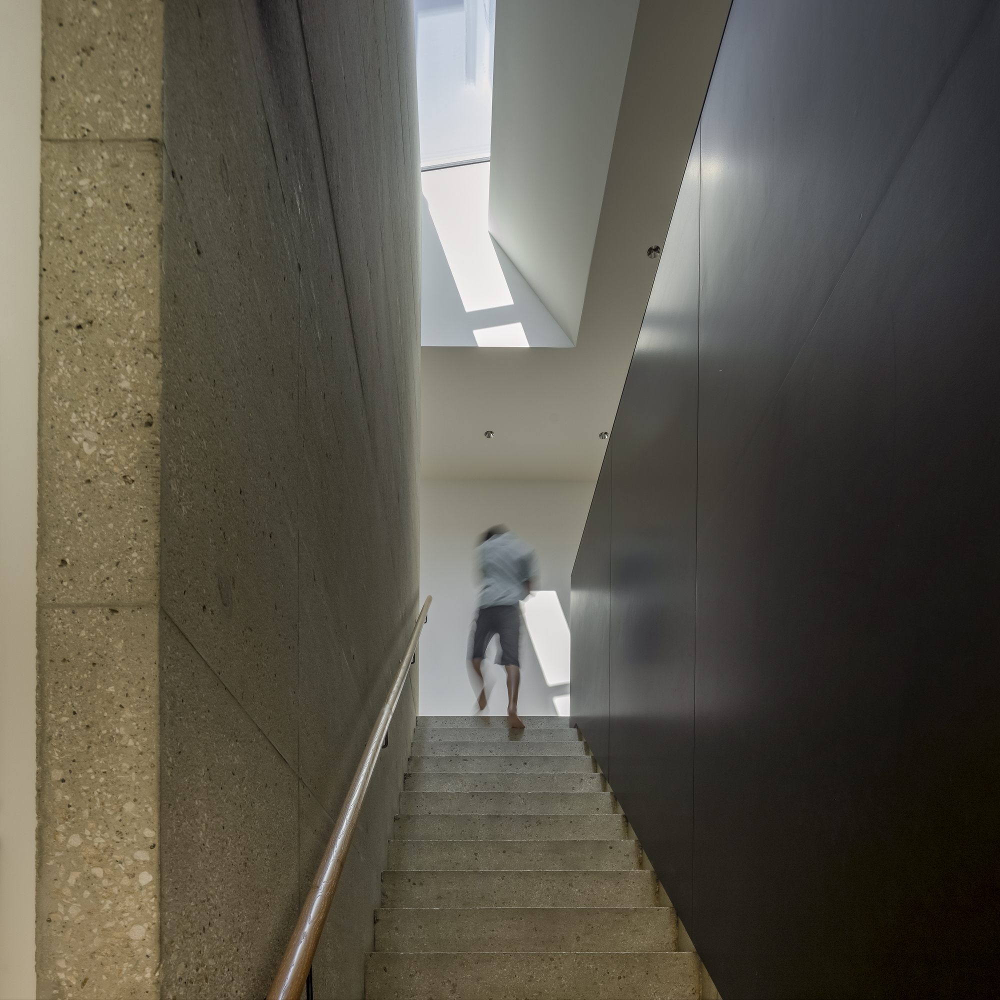 The house has two habitable floors organised around a central room with a fireplace, staircase and skylight. A very open, light and glazed upper ground floor houses the living areas and the main entrance from Chemin du Grillon, while the lower ground floor, treated as a base, houses the bedrooms and technical rooms. Accessible directly from Avenue de Belmont, the garage occupies a detached basement, which plays on the slope and the particular geometry of the plot.